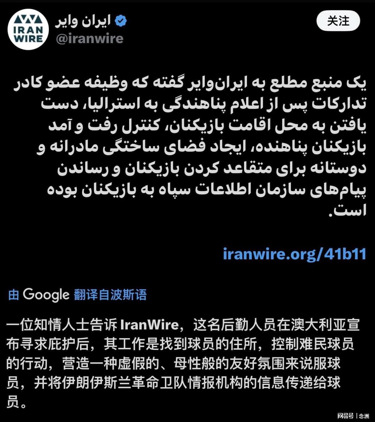 伊朗媒体iranwire透露,一位知情人士表示,这名后勤人员在澳大利亚宣布寻求庇护后,其工作是找到球员的住所,控制球员的行动,营造一种虚假的、母性般的友好氛围来说服球员,并将革命卫队情报机构的信息传递给球员。